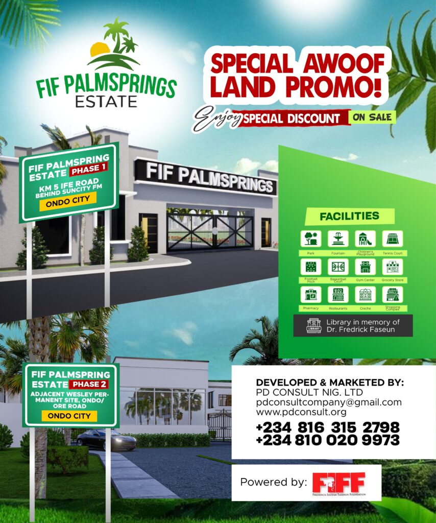 Secure a plot at FIF Palmspring Estate today and step into a lifestyle of comfort, security, and luxury. Don’t miss out on this opportunity to own a piece of Ondo City’s most sought-after community.